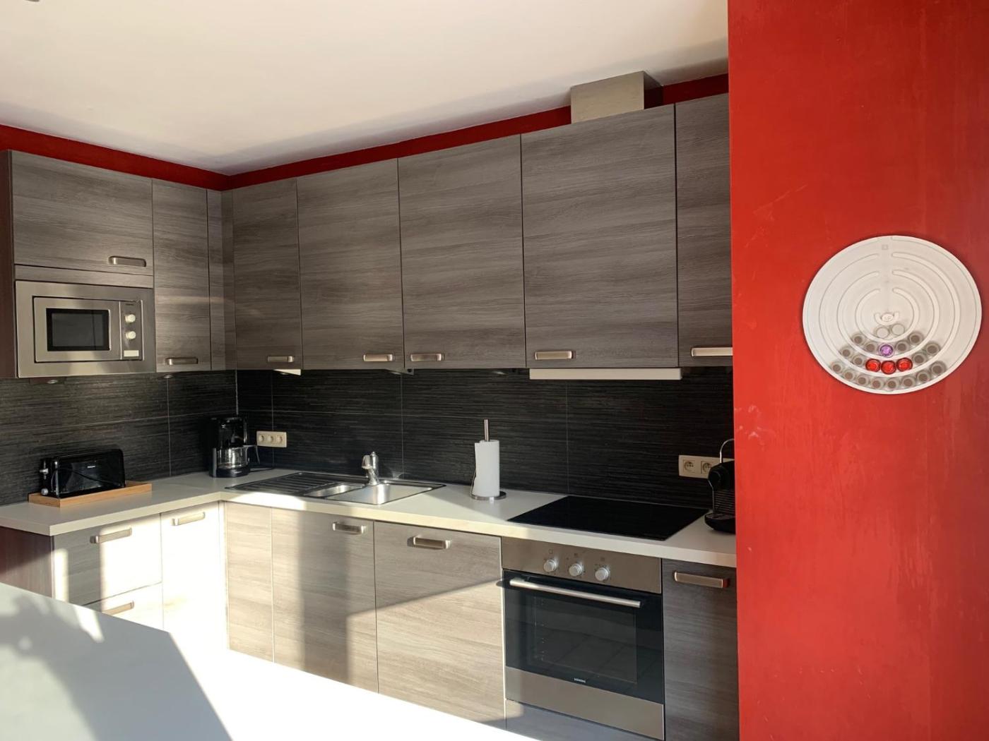 The apartment is composed of 1 bedroom, a fully equipped kitchen, and 1 bathroom. A flat-screen TV is featured.