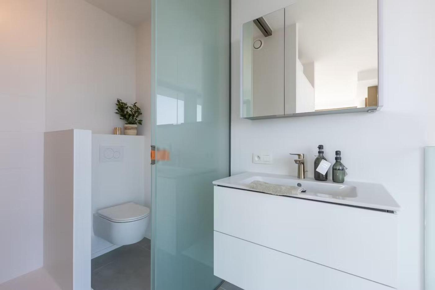 Three-Bedroom Apartment. The air-conditioned apartment has 3 bedrooms, 2 bathrooms and a kitchen. The apartments kitchen is available for cooking and storing food. Boasting a terrace with sea views, this apartment also offers heating and a flat-screen TV. The unit has 3 beds.