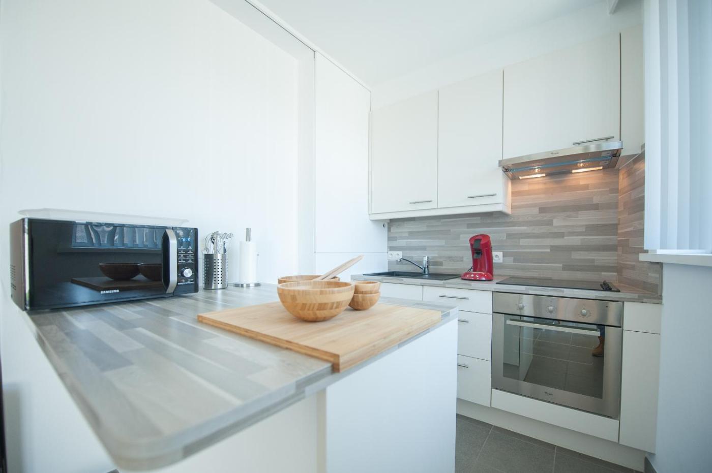 One-Bedroom Apartment. This apartment is comprised of 1 living room, 1 separate bedroom and 1 bathroom with a walk-in shower and a hairdryer. In the fully equipped kitchen, guests will find a stovetop, a refrigerator, a dishwasher and kitchenware. Featuring a terrace with city views, this apartment also offers a coffee machine and a flat-screen TV. The unit offers 2 beds.